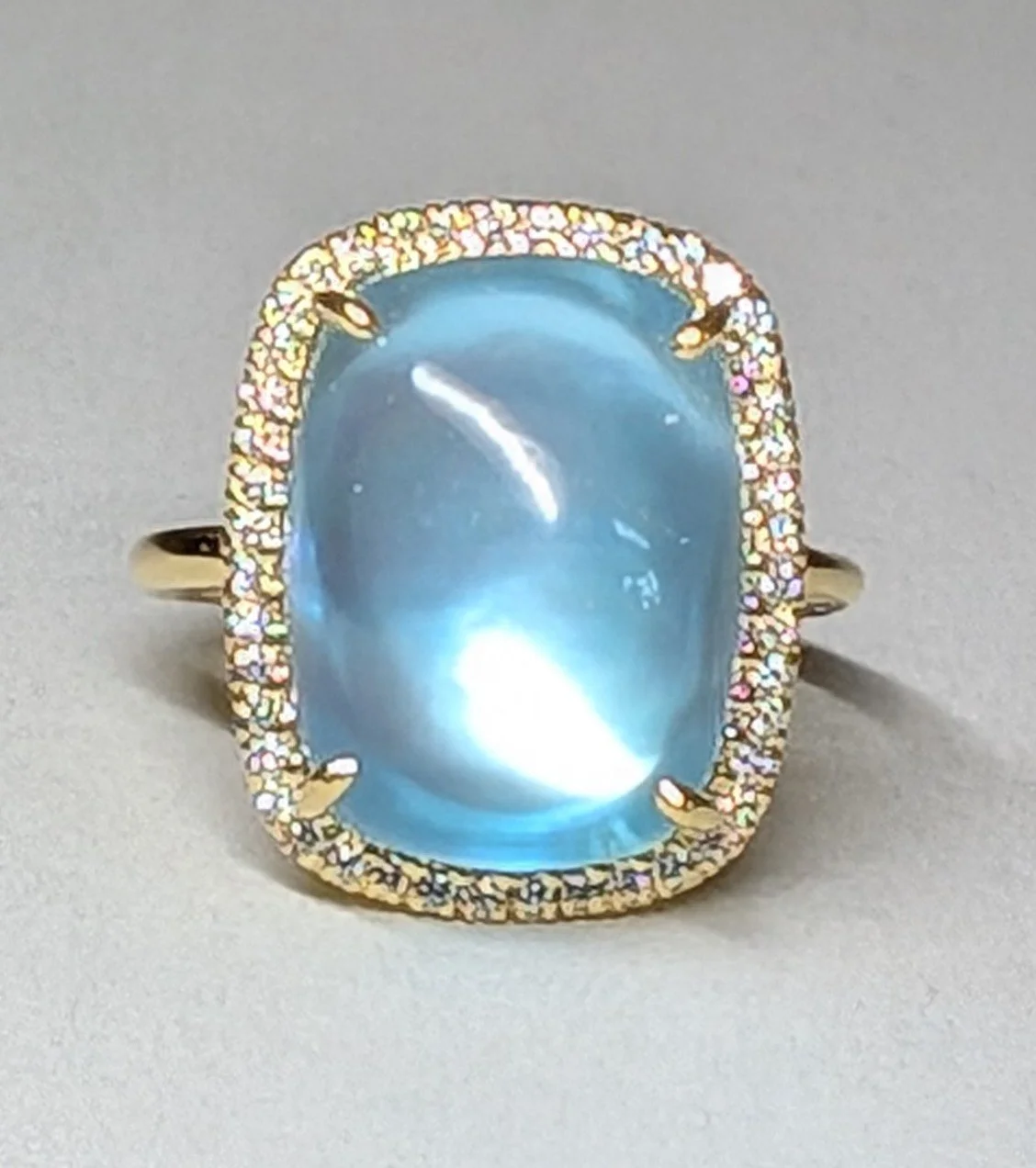 Cabochon cut blue topaz ring. Mother of pearl behind gemstone gives a silky look. 0.22ctw diamond halo. $4375 DJB-46