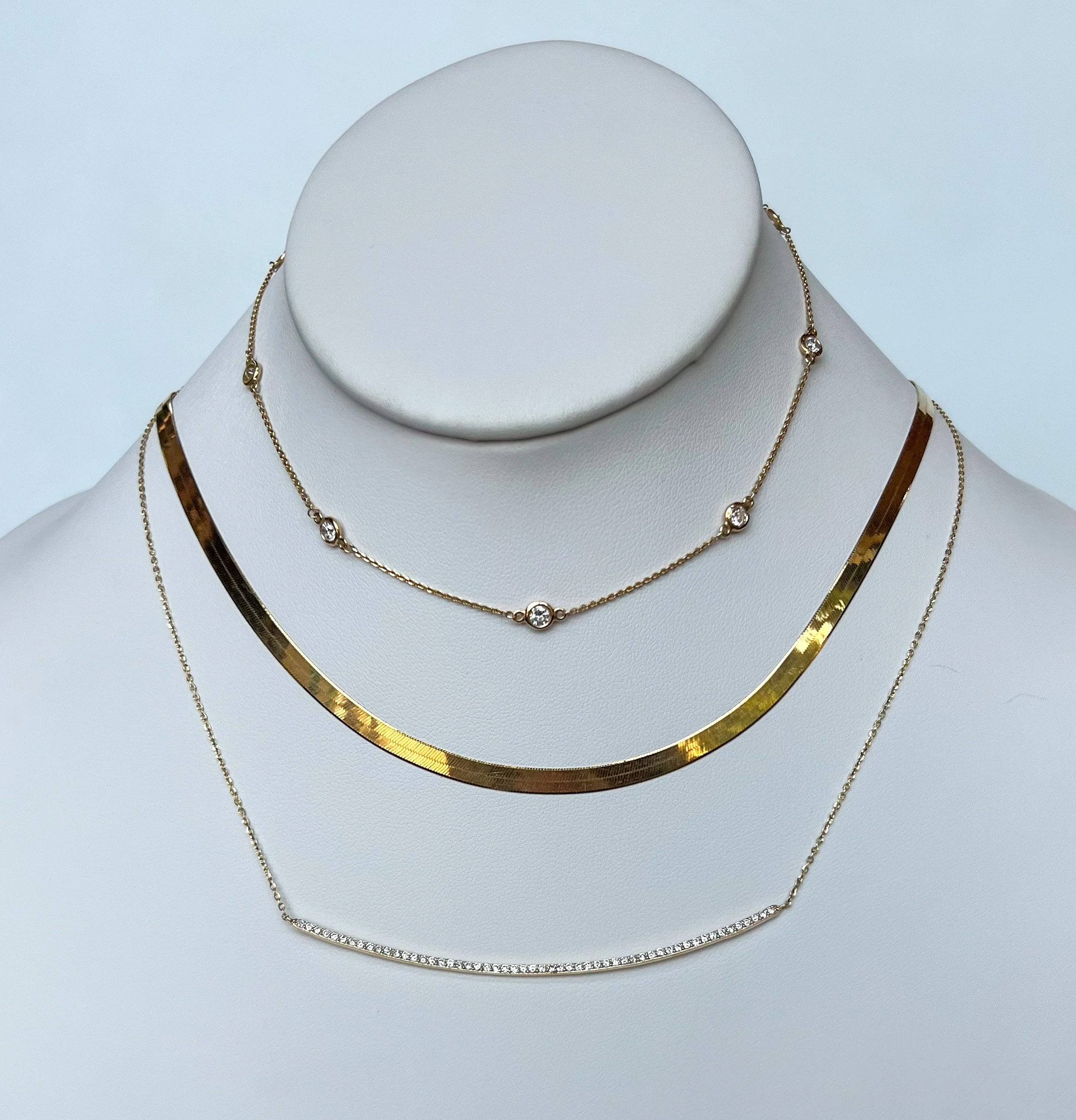 Our yellow gold diamond bar necklace($1,620) layered with a 4mm herringbone necklace($637.50), and yellow gold diamond bezel set necklace ($2,950).