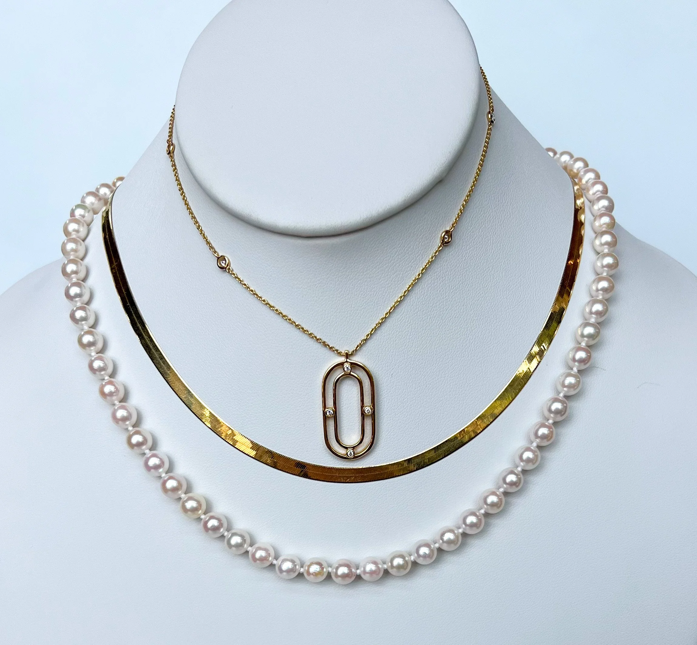 Our cultered akoya pearl strand necklace($1,200) layered with a 4mm herringbone necklace($637.50), and a yellow gold diamond necklace($2200).